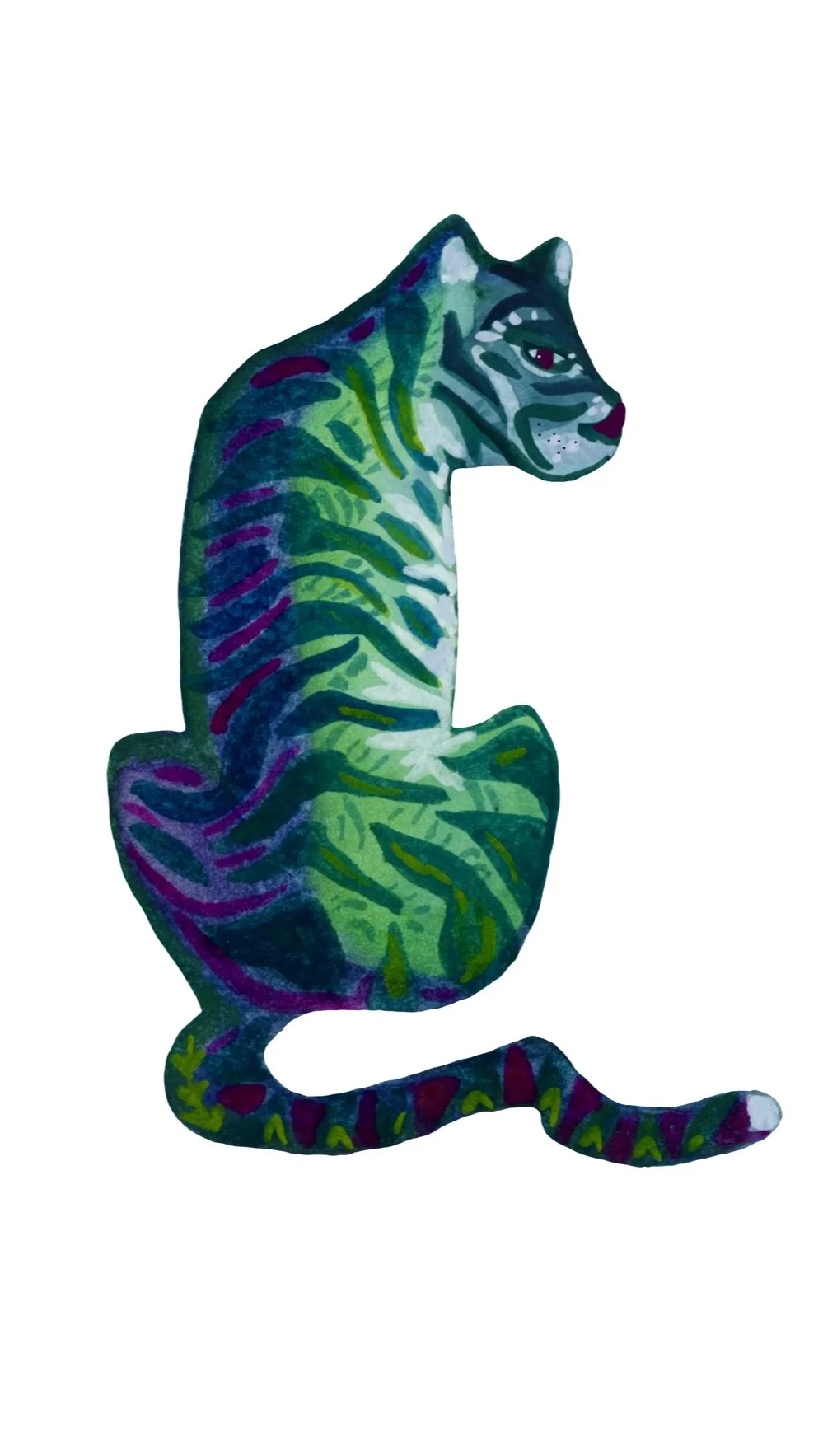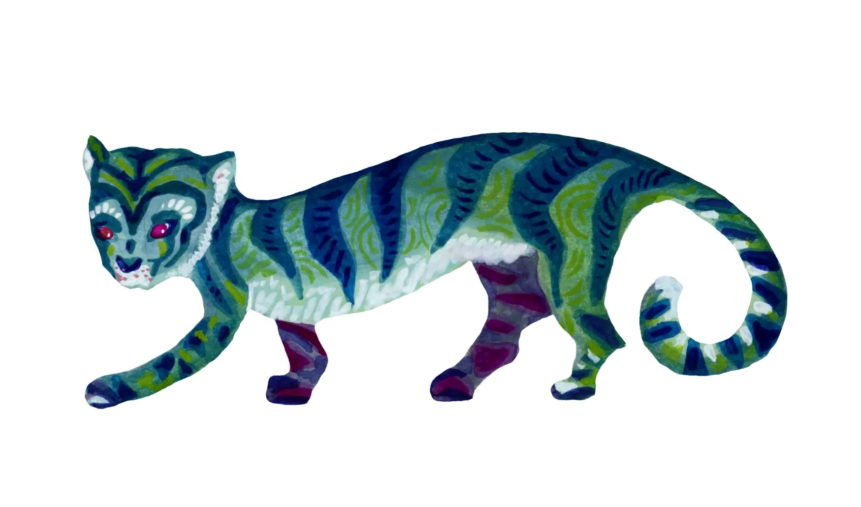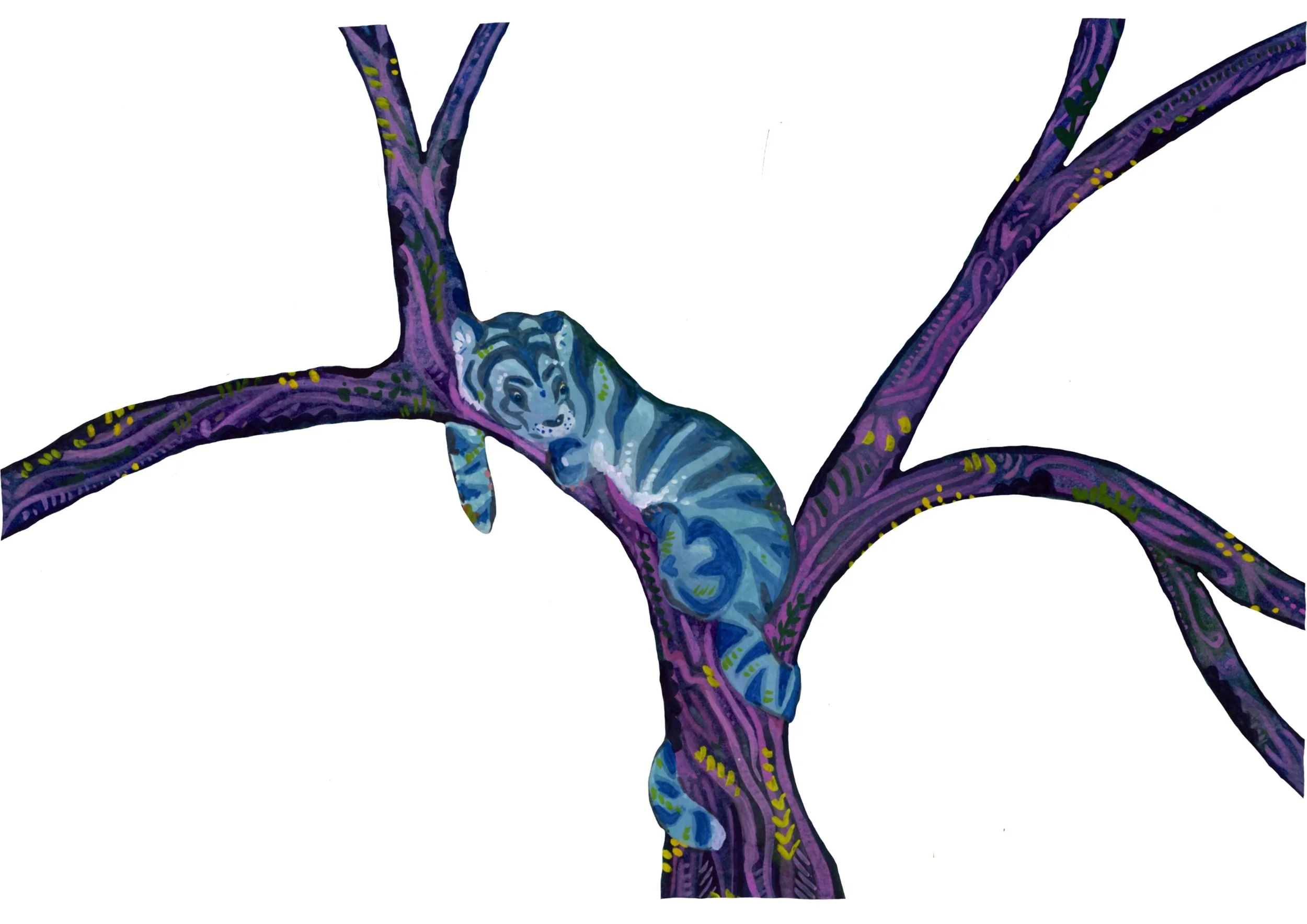 This character was developed as a personal project and now appears as a small ambassador for my work. Painted in gouache, the tiger allowed me to explore the colours, patterns, and layered mark-making that often appear in my paintings.